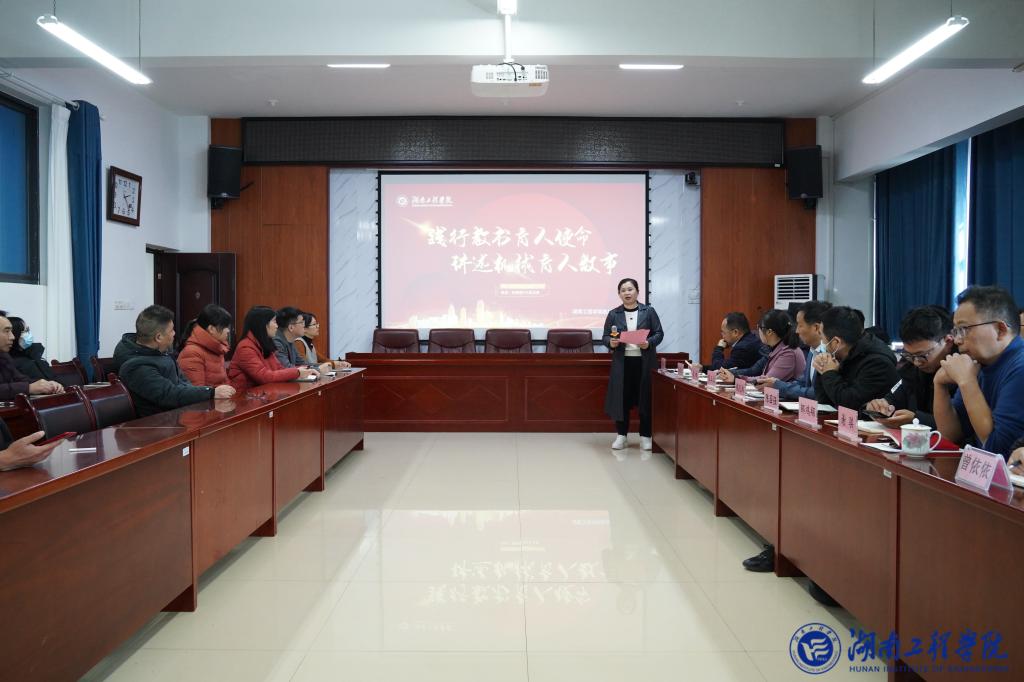 为弘扬教育家精神,践行教书育人使命,接好老教师们教书育人的接力棒,12月13日下午,机械工程学院在机械楼312室举行“践行教书育人使命 讲述机械育人故事”教育家精神学习活动。校党委委员、副校长魏克湘,学院党政主要负责人、全院教职工参加。主题学习邀请了机械工程学院谢骐和陈乐尧两位资深老师主讲。机械工程学院党委书记覃波主持活动。
