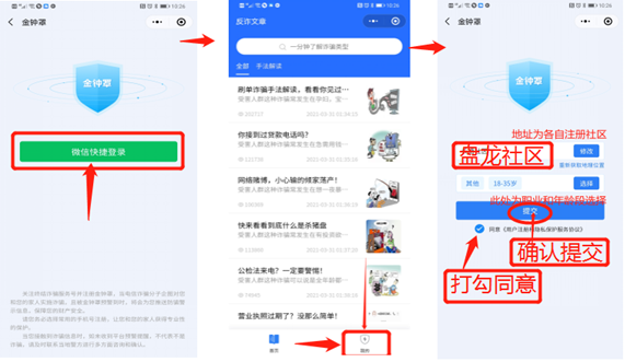 第三步:点击“微信快捷登录”并授权 第四步:点击右下方“我的”出现注册界面