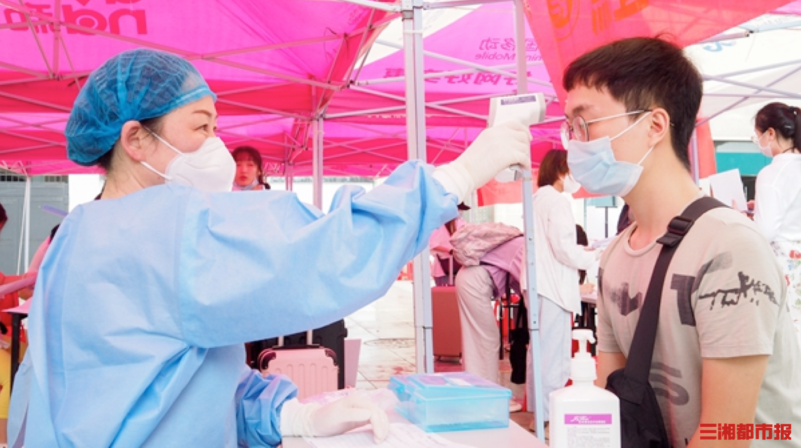 傍晚时分,火车到达湘潭北站。为迎接学生安全返校,该校安排专车和老师到高铁站、火车站、汽车站等做好接站服务,“点对点”接送返校学生直达学校。一出站,学校老师便引导他和同学们进行返校核验的程序,并拿到“登车牌”上大巴准备进校。杨千一默默地用相机记录了老师们热心服务的点点滴滴。“有个女老师的嗓子都嘶哑了,还在一遍一遍耐心地跟我们细细说着返校的每一个注意事项。”大巴车在熟悉的路上平稳行驶,同学们的激动之情难以言表。“迈进校门的那一刻,我重新对‘门’的定义有了新的认知。”