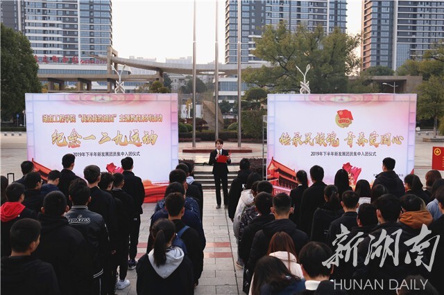 12月9日上午7点,新发展团员集中入团仪式在该校知行广场举行,庄严的升旗仪式后,现场老师为新团员佩戴团徽。面对鲜红的团旗,107位新发展团员庄严宣誓并现场学习《团章》,他们用嘹亮、坚定的宣誓表达了自己坚定的共产主义信念和爱国情感,也展现出当代青年学生奋发激昂的精神风貌。软件工程1702班雷易祥同学和工业工程1901班朱惠然同学进行了“传承民族魂 青春爱国心”纪念一二·九运动主题演讲。两位宣讲人以饱满的感情,生动的演讲,为现场师生生动再现了84年前的革命历史画面。人力资源管理1802班张嘉仪同学代表全体新发展团员表示,要努力成为一名有理想、有抱负、勇于攀登、勇于创新的优秀共青团员。