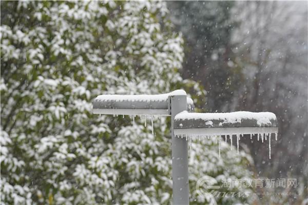 洁白晶莹的雪花满天卷地,图书馆、主教学楼粉妆玉砌、安静如画。身姿坚挺的松树被披上了一层晶莹的披肩,矮矮胖胖的小雪人好奇地盯着知行广场上来来往往的行人。