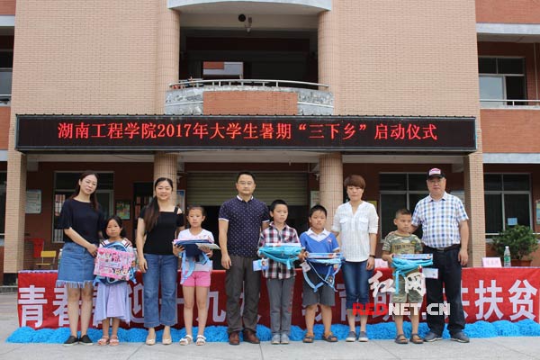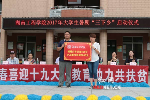 红网长沙7月7日讯(通讯员 吴晓力)7月6日上午9时,beat365官方网站赴湖南省新晃县侗族自治县新村以“青春喜迎十九大,教育助力共扶贫”为主题的暑期“三下乡”社会实践团和当地政府在兴隆明德小学举行了启动仪式暨体育学习用品捐赠仪式。晃州镇人民政府副书记陈通钰、兴隆明德小学校长杨长炳、beat365官方网站省驻村扶贫队林志刚和刘红泉、beat365官方网站学工处副处长兼团委副书记刘琤以及校学联、电气信息学院、理学院组成的“青春律动新村”实践团师生50人,兴隆明德小学近百名师生及学生家长代表参加了本次仪式。