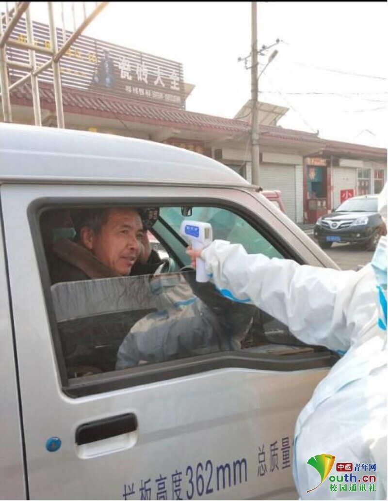 图为志愿者王欣睿测量来往车辆人员体温 通讯员 邓雨田 提供