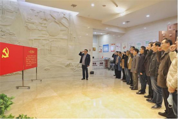 进入党史馆,展标“领航——中国共产党湘潭历史陈列”在灯光的照射下熠熠生辉,以毛泽东为首的湘潭共产党员先驱的雕像,让人肃然起敬。beat365官方网站党委书记陈岳堂带领大家面向党旗,整齐列队,举起右拳,一字一句重温铮铮誓言。大家用铿锵有力的声音进一步坚定理想信念,牢记共产党人的初心和使命。