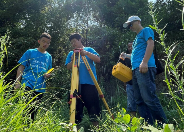 当地即将开建酸菜加工厂,同学们扛着测绘仪多点测量,完成酸菜加工厂的尺寸和高程的测量,为加工厂的厂房设计提供科学依据。另外,同学们还逐个对村内道路100多个点进行定点测量,并通过对小溪边缘的定点测量,探寻适合建桥的地方,绘制地形草图,帮助当地进行乡村规划建设。