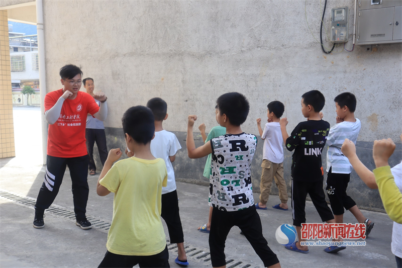 武术课上,志愿者一开始表演了一段武术,只见他双脚开立,左手从腰间冲拳而出,转马步为弓步,顺势一个照面直踢,身轻如燕,腾空再踢,落下时竖岔着地,双臂侧平举立掌……动作好比行云流水一般,赚足了眼球,甚至把孩子的家长们也吸引了过来。孩子们的热情一瞬间被点燃,纷纷喊着要学。随后,志愿者们把动作逐一分解,一步步耐心地教孩子们。围观的家长欣慰地说到:“志愿者们的这个支教活动非常好,孩子能在课上学到很多平时接触不到的东西。”