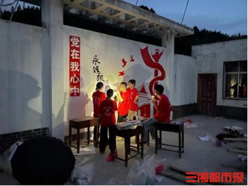 由设计艺术学院党委组织的“寻初心,种红心”团队则围绕“人居环境改造,建设美丽家乡”主题,让设计入村,助力乡村振兴。为进一步美化村庄环境,提升村容村貌,助推乡风文明建设,同学们清晨6点半出发,开始进行村里人居环境改善。“虽然有点累,但是我还是觉得值得的,希望会同县的村居变得越来越好。”为了更好地建设“美丽乡村”,在带队老师的指导下,同学们结合专业特点,发挥特长,通过墙体绘画装点村容村貌,坚定乡村新时代爱党敬党的精神信念。同学们还将红色元素和吊脚楼相结合,设计出独具风格的墙绘方案。
