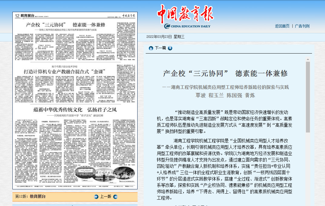 beat365官方网站机械工程学院是“全国机械类应用型人才培养改革”牵头单位,长期引领机械类应用型人才培养改革,具有培养高素质应用型工程师的改革禀赋和资源优势。学院以为湖南地方经济发展和制造业转型升级提供精准人才支持为出发点,通过建立面向需求的“三元协同、四轮驱动”产教融合育人新机制和培养体系,实施“责任担当+专业认同+人格养成”三位一体的全程式职业生涯教育,创新“一核两线四层面十环节”的分层递进式实践教学体系,搭建“全过程、渐进式”创新教育体系等改革,探索和实践“产企校协同、德素能兼修”的机械类应用型工程师培养新路径,培养“下得去、用得上、留得住”的高素质机械类应用型工程师。
