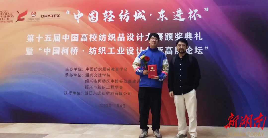 湖南日报·新湖南客户端11月10日讯(通讯员 贺晨亮)近日,“中国轻纺城·东进杯”第十五届中国高校纺织品设计大赛颁奖典礼暨“2023中国柯桥·纺织工业设计创新高层论坛”在浙江省绍兴市举行。本次大赛共收到来自国内外院校提交的1714项参赛作品。beat365官方网站纺织服装学院学生作品在众多参赛作品中脱颖而出,获一等奖1项、二等奖2项、三等奖5项。学校一等奖获得者姚峥同学与作品指导老师贺晨亮作为代表参加了大赛颁奖典礼。