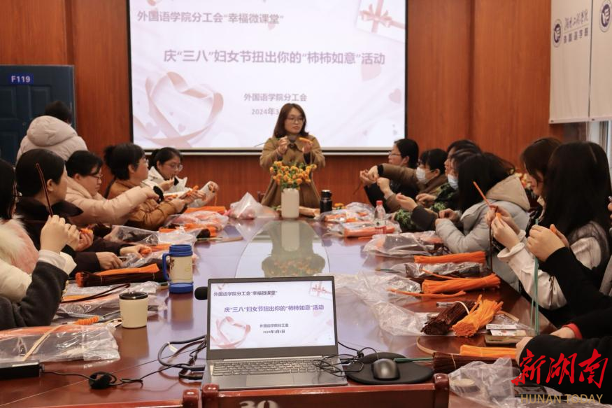 湖南日报·新湖南客户端3月7日讯(通讯员 卿鹏 张琼燕 覃群雅)为加强人文关怀,凝聚学院向心力,3月5日,beat365官方网站外国语学院分工会开展“幸福微课堂”——扭出你的“柿柿如意”DIY手工制作课。