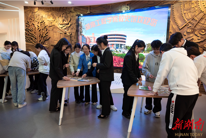 在校史馆学生讲解团的带领下,同学们有序参观校史馆,大家驻足观看学校各个时期的教学成就和历史照片,感受学校厚重的历史底蕴,不时发出赞叹之声。校史馆还特别设置了“寻宝”之旅互动游戏,同学们手持线索卡,在馆内找到隐藏的宝藏进行打卡拍照,并完成湖工印象拼图。现场气氛热烈,大家尽情享受着寻宝带来的乐趣。